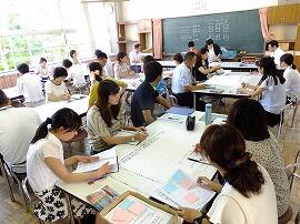 6月24日(水)の放課後に職員が一堂に集まり,今日の2つの公開授業について授業研究会を行いました。6つのグループに分かれて,それぞれの授業について,よかった点と,改善するとよいと思われる点について出し合いました。