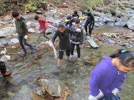 次に向かったのが木の葉化石園と下戸倉沢です。化石園では、カエデやブナなどの木の葉やトンボなどの化石を熱心に見ていました。紅葉の下でお弁当を食べた後は、川原で化石探しをしました。下戸倉沢は海に堆積してできた地層なので、貝の化石が見られます。石を拾っては「これ化石ですか!?」と言うなど、みんな夢中で化石を探していました。