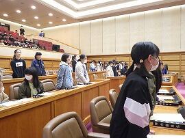 市議会体験をしてきました。初めに市議会とは何かという説明を聞き、議場内を自由に見学しました。その後、実際に市長役や議長役を決めて議会体験を行いました。体験や見学を通して、「議員の人数を初めて知った。」「議長がどのように選ばれるのかがわかった。」「自分の意見をしっかりもつことが大切なのだ。」と感想に書くなど、議会についてしっかり学んできました。