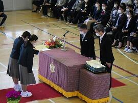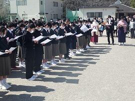 室内での活動制限があるため,別れの言葉は校庭で行いました。晴れの門出を祝うような青空の下,教職員と卒業生が向かい合う隊形で始まりました。はじめに先生方へ感謝する会も行い,別れのことばは,在校生のセリフを教職員が行う初めての取り組みとなりました。最後に「旅立ちの日に」を歌い,105名が元気に卒業していきました。最後の貴重な一か月が失われてしまったしまったことは残念でなりませんが,卒業式ができない学校もある中,実施できただけでもよかったです。卒業生の皆さん。ご卒業おめでとうございました。