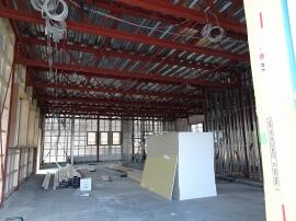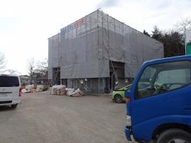 チャイルド(放課後子どもクラブ)の建物の完成が近づいてきました。東側のネットも完成しました。壁面や内装もほとんど出来上がってきたようです。窓やドアもすべて入っていました。2階には,カーテンがすでに設置されていました。今日は,たたきの部分のコンクリートを流し込んだようで,立ち入り禁止のテープが張ってありました。完成はもうすぐですね。