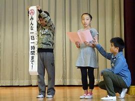 続いて児童会プロジェクト委員から,「スマホケータイの宮っこ宣言」がされ,全校生がみんなで唱和しました。み:みんな1日1時間まで, や:夜間の友達との通話は9時まで, つ:使う前にはフィルタリング, こ:個人情報はのせません。