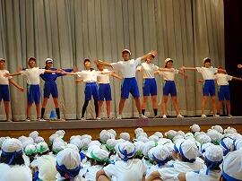 今日は,2回目の全体練習を行いました。今日の内容は,敬老者への挨拶,応援歌の練習,校歌の練習,応援練習です。応援団の児童と合わせるのは初めてなので,1つ1つ区切って,応援団の人の言葉と全体の児童との言葉を合わせる練習をしました。エール交換やウエーブなども練習をしました。