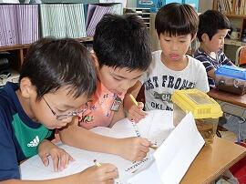 4時間目は,3時間目に見てきたこと,気が付いたことをプリントに書き込みました。生き物の様子をできるだけ詳しく書こうと一生懸命に取り組みました。友達と一緒に机を寄せ合って,書き込んでいる子もいました。クーピーや色鉛筆を使って,カラフルに生き物をぬりました。おもしろいことや新しい発見をたくさん見つけることができました。もっと見たり,触ったりしていたい2時間でした。