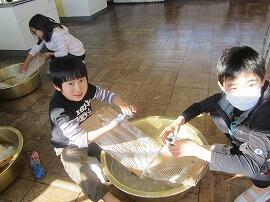 無事に洗い終わった児童の感想は,「手が冷たくて大変だった。」「昔のお母さんは,家族の分の洗濯物を洗濯板で洗っていたなんてすごいなぁ~。」「水をしぼるのに力がいるからつかれる。」など大変さに気づきました。一方で,「あんなに汚かった靴下が真っ白になった。」「洗濯機より汚れが落ちる!」「せっけんの良い匂いがする。」など昔の人のくらしの工夫も発見することができました。