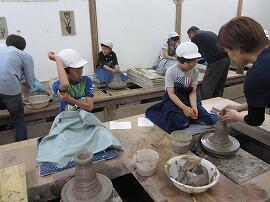 横山陶芸で,まずは説明を聞きました。スタッフさんが自由自在にろくろをまわして粘土を扱っている様子を見て,子供たちは「すご~~い!」「むずかしそう~!」などと興奮していました。