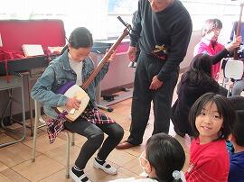 初めて生で三味線の演奏を聞いた子どもの興奮は最高潮!「ギターみたいで格好いいね。」や「三味線て意外と大きいんだね。」,「三味線も伝統文化だよね。」と大喜びでした。