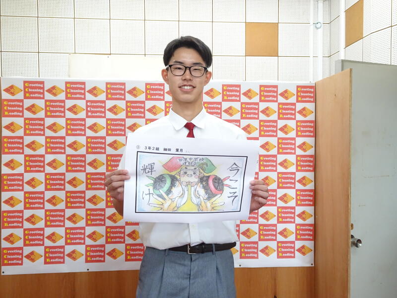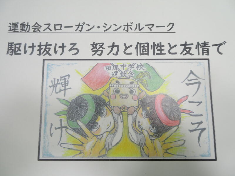 運動会実行委員会で応募した運動会スローガン・シンボルマークが本日決定しました。素晴らしい作品が数多く集まり、最終的に3年生2名の作品が選ばれました。スローガンは「駆け抜けろ 努力と個性と 友情で」になりました。お昼の放送で実行委員長から発表がありました。