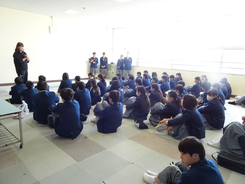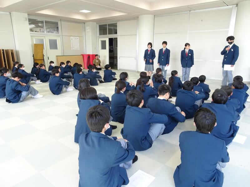 4月10日(金)5校時、新入生歓迎会を行いました。生徒会本部役員代表生徒から歓迎の言葉があり、生徒会専門委員会と中央委員会(本部役員)の活動内容についてスライドを使って説明がありました。その後、各部活動から活動内容や実演を含めての部活動紹介、生徒会本部役員から運動会や合唱コンクールなどの学校行事について説明がありました。新入生は、目を輝かせながら先輩たちの説明を聞いていました。新入生代表生徒のあいさつでは、これからの中学校生活を楽しみながら頑張っていこうという意気込みが伝わりました。