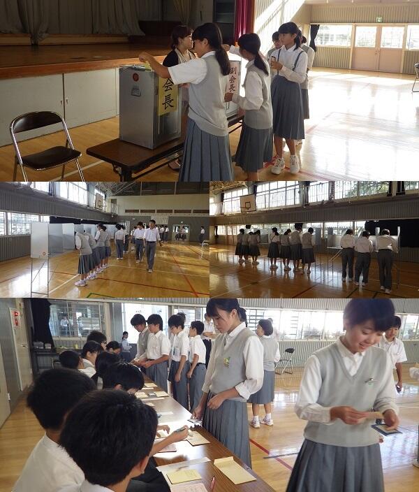本日の登校時間において,生徒会本部役員選挙(会長選・副会長選)の投票を体育館で行いました。投票のために,いつもより早く登校してくださった生徒のみなさん,ありがとうございました。