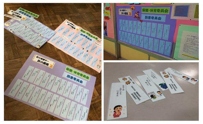 先日、目の愛護デーに合わせて、保健体育委員会・給食委員会・図書委員会の3つの委員会がコラボした集会を行いました。そのほかにも、保健と図書のコラボとして、目の標語を作成し、しおりと掲示物を作成しました。これは、田原小と田原西小にもプレゼントしました。田原地域みんなで目について考える機会となればと思います。