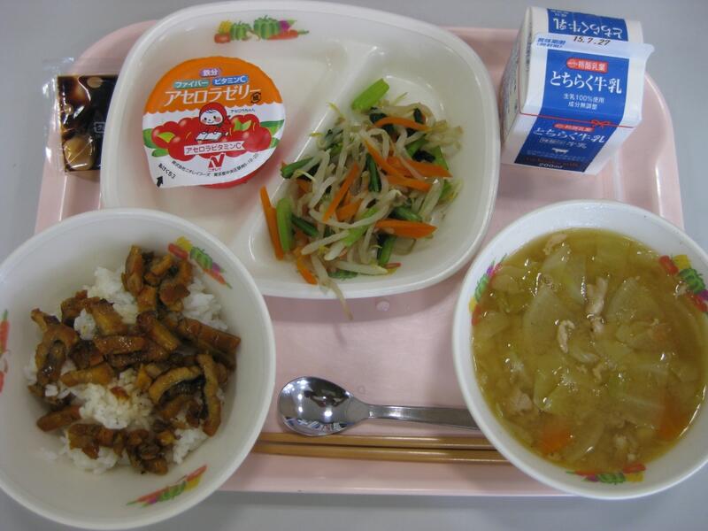 給食ではうなぎのかわりにあなごで名古屋名物「ひつまぶし」風にしました。