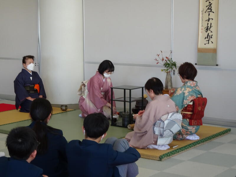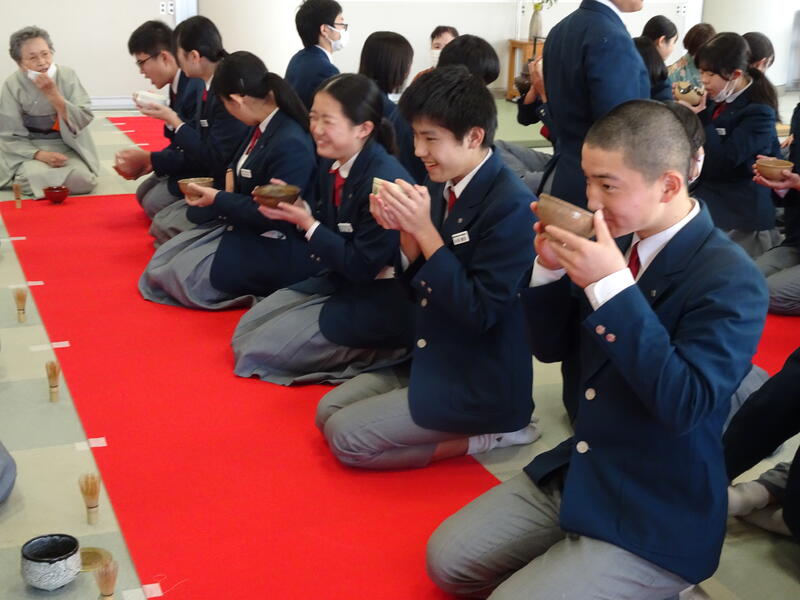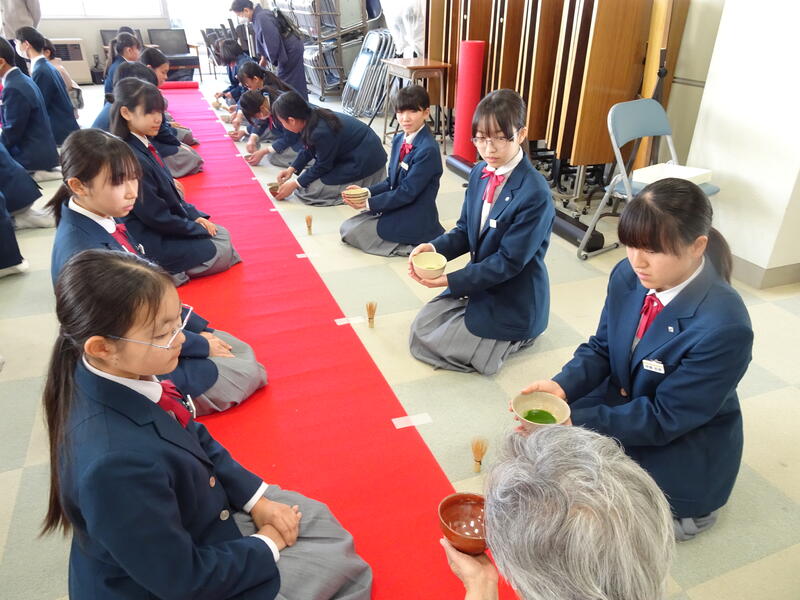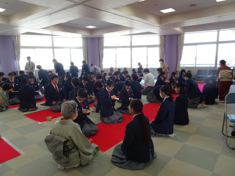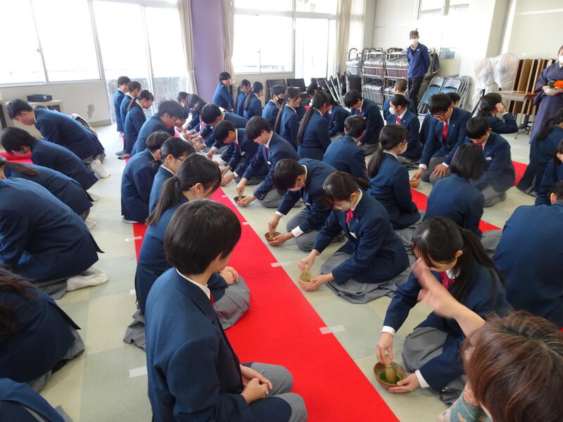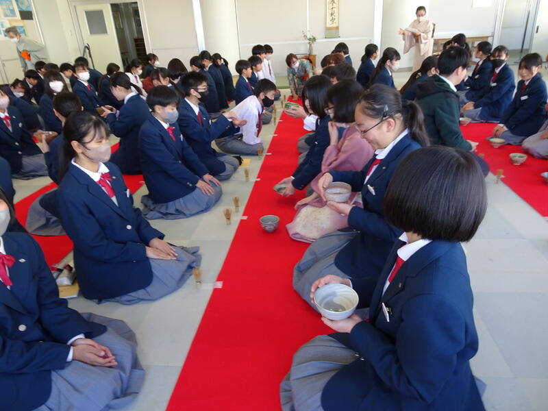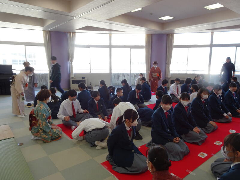 12月23日(火)、1年生は2校時、2年生は3,4校時、3年生は5,6校時に茶道教室を行いました。11名の講師の先生に来ていただき、茶道に関するお話や、実際にお菓子の食べ方やお抹茶の点て方、飲み方などを学び、実際に体験することができました。「礼」や「あいさつ」などのマナーを大切にする心を育むことを目的としていますが、『相手に対する思いやりや、道具を大切に使う心も大切』というような意見も生徒から出ました。茶道教室は毎年行っており、2年生は一度、3年生は二度体験しているので、講師の先生の話を聞き、前年度の事を思い出しながら行っていました。素敵な時間を過ごすことができました。