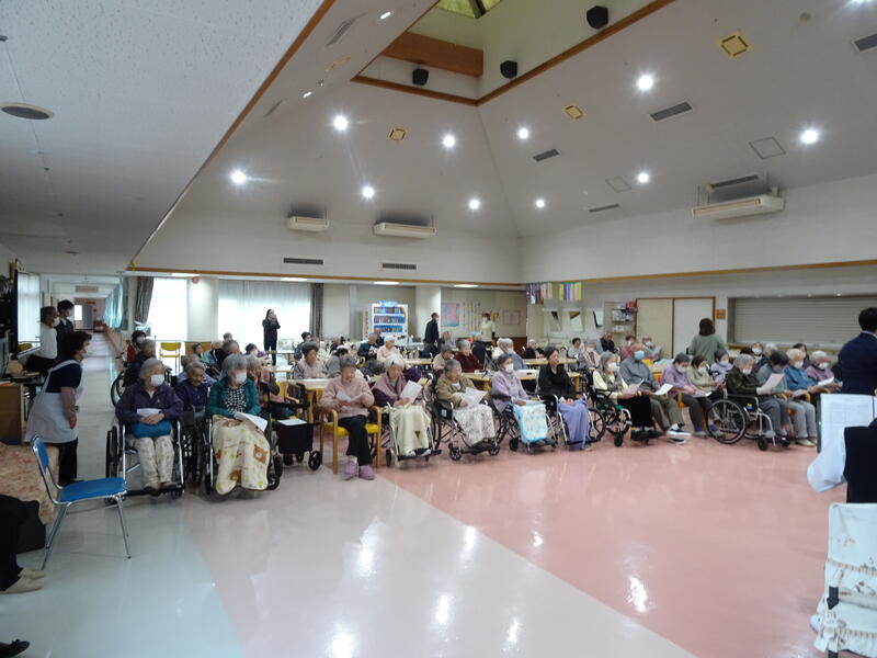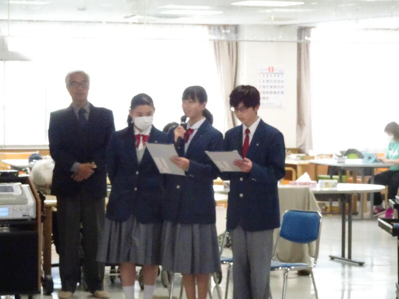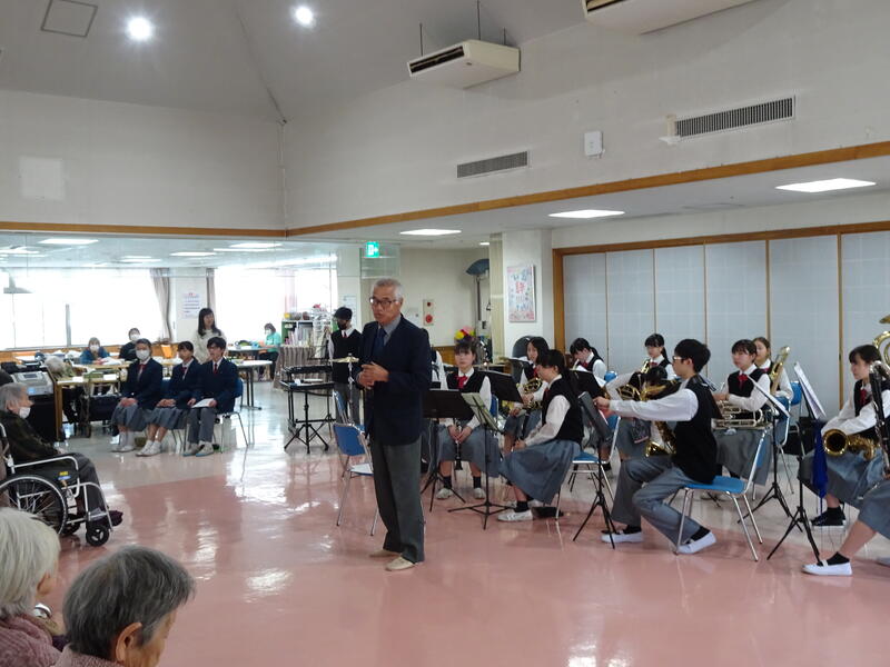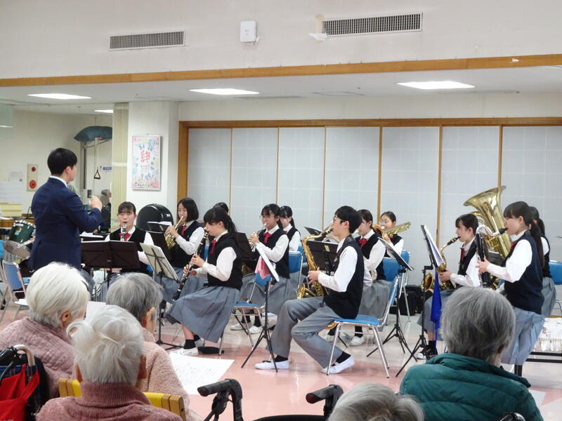 本日、地域協議会活動の一環として、特別養護老人ホーム「さくらの杜」訪問を行いました。地域協議会長様のあいさつから始まり、生徒会役員の進行で、吹奏楽部の演奏を高齢者の方々に楽しんでいただきました。元気が出る曲、各パートの紹介、そして最後に「ふるさと」を演奏し、高齢者の方々も口ずさんでいました。このような交流活動は今後も大切にしていきたいです。