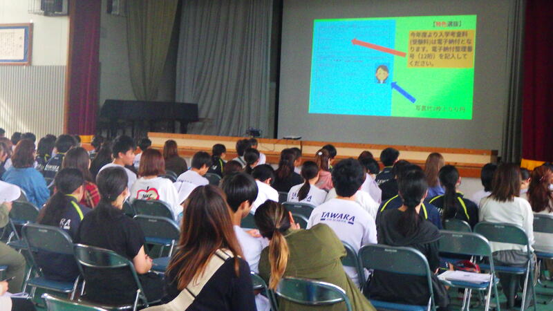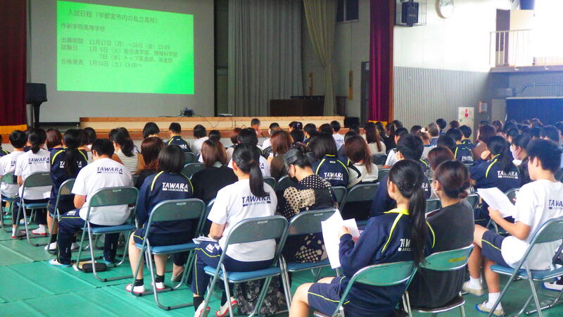 本日、10月3日(金)5・6校時に、体育館にて高校入試進路説明会を実施しました。進路指導主事より、私立高等学校の受験制度やインターネット出願等について、県立高等学校の入試の種類や入試日程、特色選抜や一般選抜について、そして大切な出願手続きについて説明がありました。この説明会が終わり、いよいよ入試という言葉が現実味をおびてきました。生徒一人一人の進路希望の実現に向けて、家庭と学校が協力し合って支援していきます。