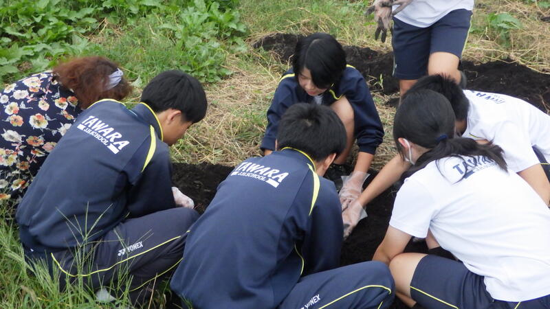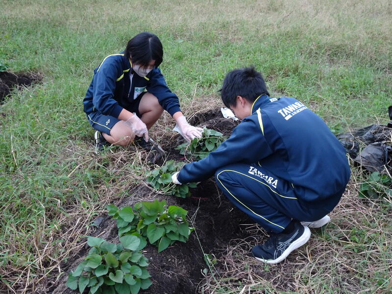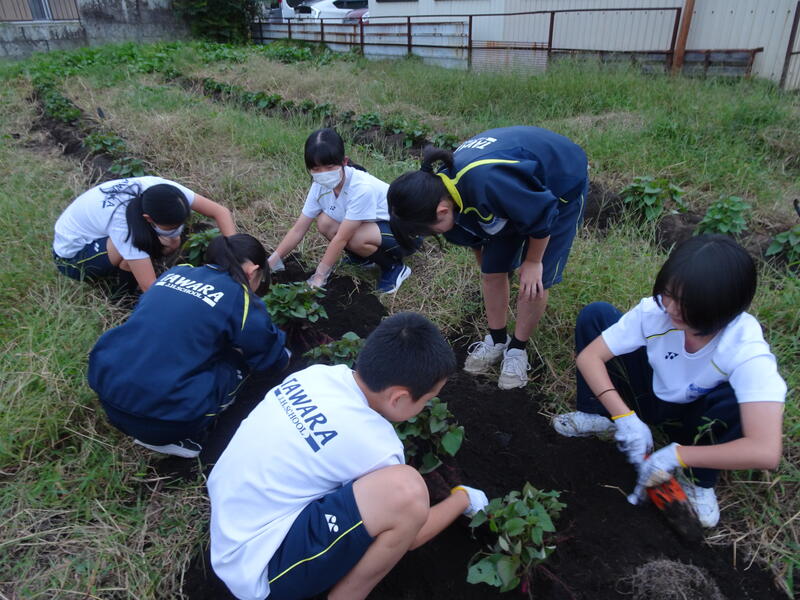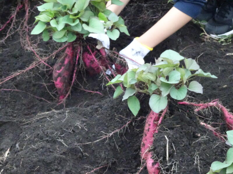 本日放課後、給食委員が学校農園に植えたさつま芋堀りを行いました。苗から育てたさつま芋、どんな芋ができているのかとても楽しみでした。芋を傷つけないようにスコップで上手に根元の土をほぐしました。抜くのに苦労しましたが、たくさんの芋が取れました。給食でも使う予定ということで、とても楽しみです。