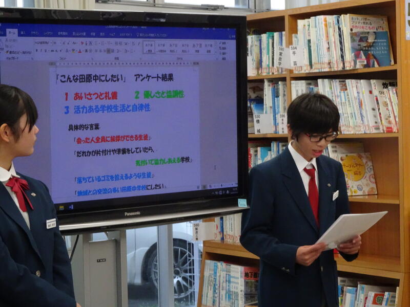 11/7(金)第3回地域協議会・たわら地域未来会議が行われました。たわら地域未来会議では、生徒会役員を中心として、「こんな田原中にしたい」という議題で話し合いをもちました。まず、全校生のアンケート結果を発表し、その結果を受けて、田原中をよくするにはどうしていくのがよいのか、3つのグループに分かれて話し合いました。主に、あいさつに関すること、あいさつ運動について等の話が出ました。協議会委員の方々からも、様々なアドバイスをいただきました。また、地域協議会では、下校指導に協力していただき、パトロール状況報告をしていただきました。有意義な会議になりました。ご協力ありがとうございました。