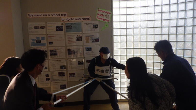 11/7(金)6校時終了後、避難訓練(不審者対応)を実施しました。東警察署のスクールサポーターが不審者役となり、昇降口から校舎に入り教室廊下を徘徊する設定で行いました。警察への通報訓練も副校長が行いました。3年生は、各教室扉前に机でバリケードを作り、教室南側に移動、犯人に顔を見られないように、そして犯人の顔を見ないように工夫しました。先生方が不審者を確保し訓練は終了しました。その後、避難訓練集会を行いました。生活安全委員長の話の後に、生徒はDⅤDを視聴しました。登下校時や外出時に不審者に会った時の対処法や、「自分の身は自分で守ること」「まわりと助け合うこと」の大切さを学びました。並行して、先生方はさすまたの使い方の講習を受けました。生徒も、先生方も熱心に訓練を行うことができました。