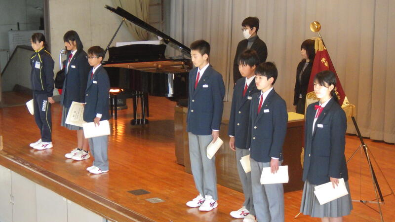 3月9日(月)に、同窓会入会式・表彰式・卒業式予行を行いました。同窓会入会式では、同窓会長様、副会長様をお招きし、同窓会長賞表彰を行い、会長様より挨拶をいただきました。その後、各学級代表者生徒の紹介,入会者代表生徒の挨拶がありました。今年度、新たに71名が田原中同窓会に加わりました。また、表彰式では、宇都宮市青少年賞や学校長賞など、3年生対象の様々な表彰を47名に行いました。その後は卒業式の予行練習を実施し、生徒たちは熱心に取り組むことができました。