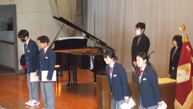 2月24日(火)5,6校時に3年生を送る会を実施しました。実行委員長の挨拶、校長先生の言葉があり、1,2年生の出し物が行われました。各学年とも工夫を凝らした内容で、3年生も集中して見学していました。1年生のフラワーペーパーで作った『あ・り・が・と・う』、そして、2年生の『3年生へのメッセージ』と『“あなたに会えて”の歌声』が特に素晴らしかったです。手作りの出し物で、温かさを感じました。後半は、生徒会が作成した「思い出のスライド」を流しました。3年生が1年生の時からの行事が流れ、スライドが変わるたびに歓声が上がり、盛り上がっていました。そして、最後に、卒業記念品贈呈、3年生代表の挨拶と続きました。3年生の卒業を祝い、1,2年生の感謝の気持ちが伝わる素敵な会になりました。