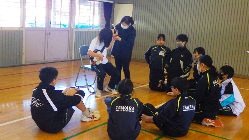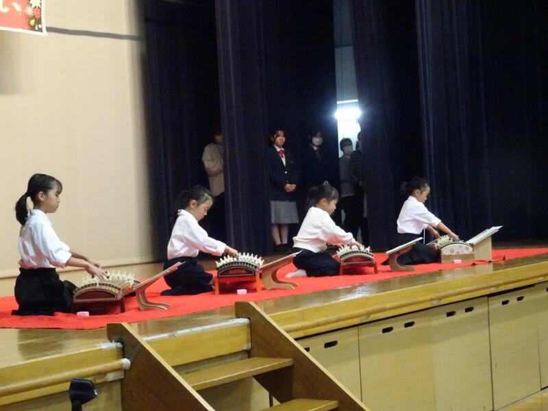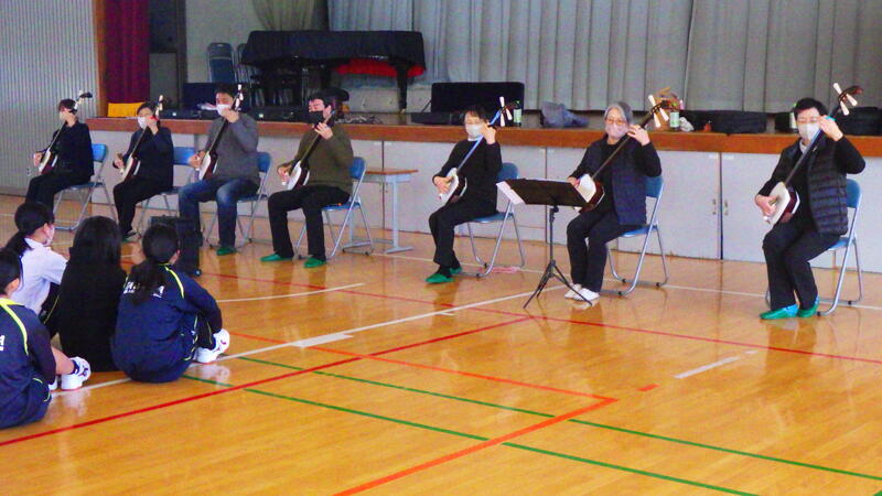 12月15日(月),1年生を対象に「ふれあい文化教室」を実施しました。津軽三味線の名曲「津軽じょんがら節」の演奏を間近で聴いたり,6グループに分かれて三味線の体験を行ったりしました。講師の先生方から「覚えが早い」と驚きの声があがり,一人一人,三味線で音階を弾くことができるようになりました。日本の伝統音楽のよさを味わう貴重な体験ができました。