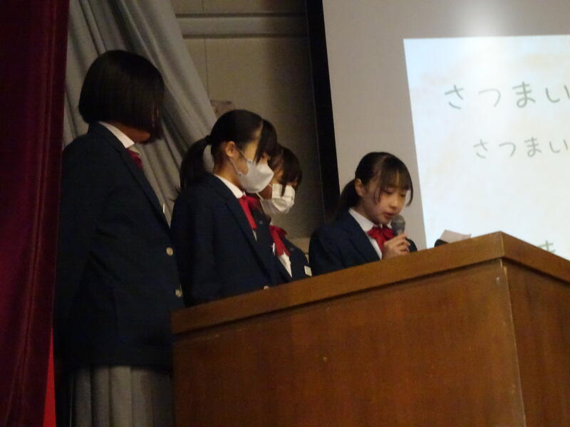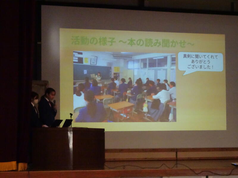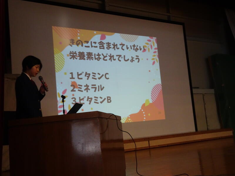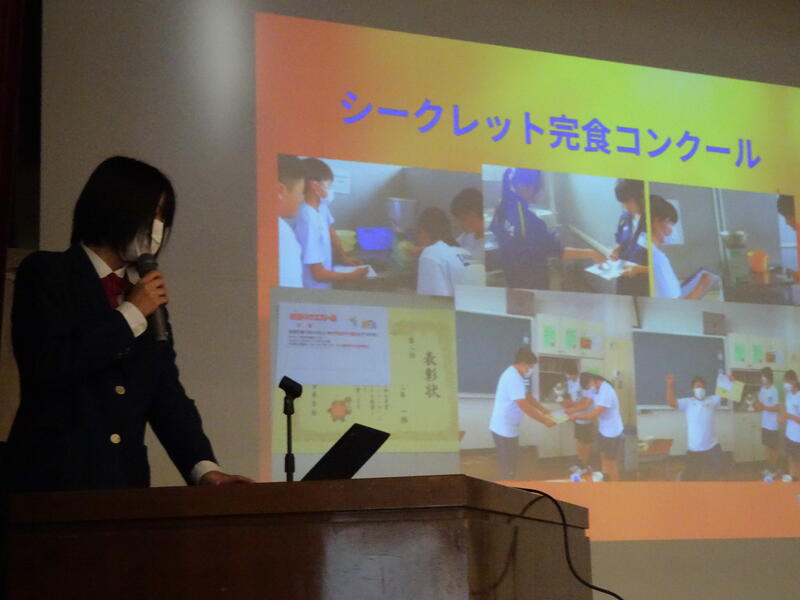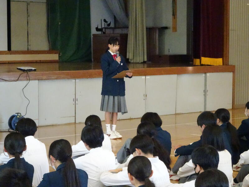 今朝、体育館にて生徒会朝会が行われました。まず、生徒会長からGCR活動(あいさつ・清掃・読書)についての話があり、次に図書委員会、給食委員会の発表がありました。それぞれの委員会で、タブレットを使って資料を作り、クイズを交えながら、活動内容について説明しました。生徒たちは発表をよく聞いていました。生徒会の積極的な活動が学校の活性化につながります。今後も頑張ってほしいと思います。