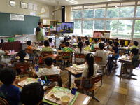 給食の時間に6年生の教室に行くと,お話給食の動画を見ながら,「にぎやかうどん」をおいしそうに食べていました。