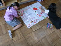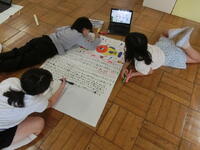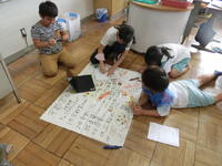 2班に分かれて,折り紙で作った「宝」を探すゲームをしていました。制限時間は5分間。教室内のあちらこちらを真剣な表情で見渡し,探していました。見つけた時にはみんな満面の笑顔。とても楽しそうな宝探しでした。
