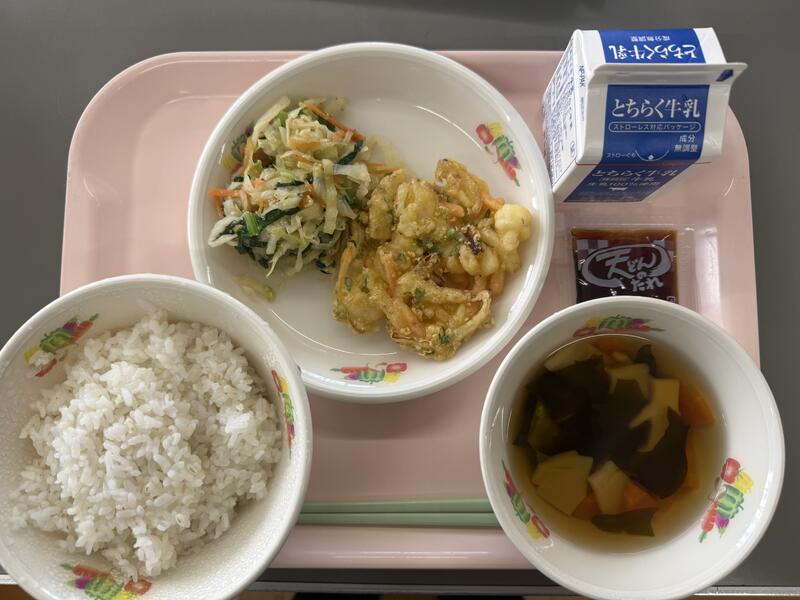 献立:麦入りご飯 牛乳 セルフかき揚げ丼 ごまあえ 若竹汁