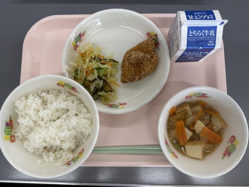 献立:麦入りご飯 牛乳 モロのから揚げ 塩昆布和え 生揚げと野菜の煮つけ