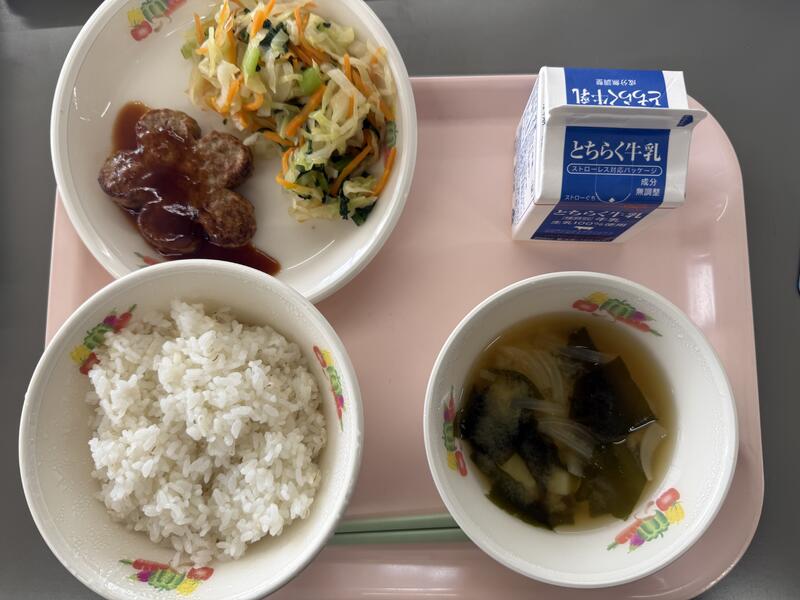 献立:麦入りご飯 牛乳 ハンバーグケチャップソース ゆで野菜 青じそドレッシング 味噌汁