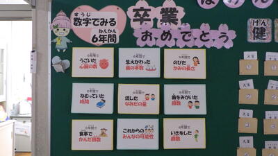 3月18日に予定されている卒業式に向けて,昇降口前と6年生の教室前に,卒業祝の桜の木の掲示物を飾りました。桜の花の形のメッセージカードには,児童一人一人から6年生への感謝と応援,祝福のメッセージが書かれています。