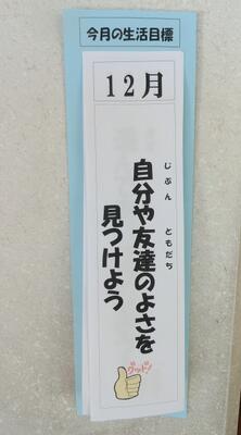 今月の生活目標は,「自分も友達も大切にしよう」です。12月1日(月)から12月5日(金)までは,校内人権週間として,「ふわふわ言葉集め」や学級のよいところ紹介,人権に関する絵本の読み聞かせなどの取組を実施しました。併せて,「なかよし週間」として各学級で児童一人一人と学級担任が話をする教育相談を行いました。