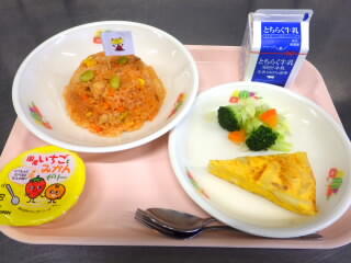 【給食】チキンライス、牛乳、アンサンブルエッグ、