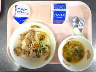 【給食】麦入りご飯、牛乳、ビビンバ丼、