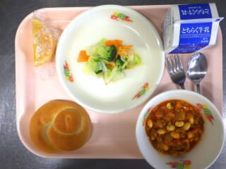 【給食】麦入りご飯、牛乳、挽肉と豆のカレー、