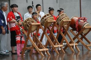 本校の逆面地区の子どもたちと中学生で、多くの人たちに伝統芸能を披露しました。午後3時ということもあり、猛暑の中20分間、かしらをかぶりながらがんばって踊り続けました。また、女子によるお囃子の音色がお祭り気分を盛り上げてくれました。