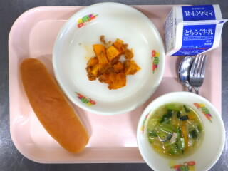 【給食】麦入りご飯、牛乳、二色丼、かぶと