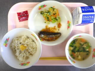 【給食】麦入りご飯、牛乳、秋鮭のねぎソースがけ、