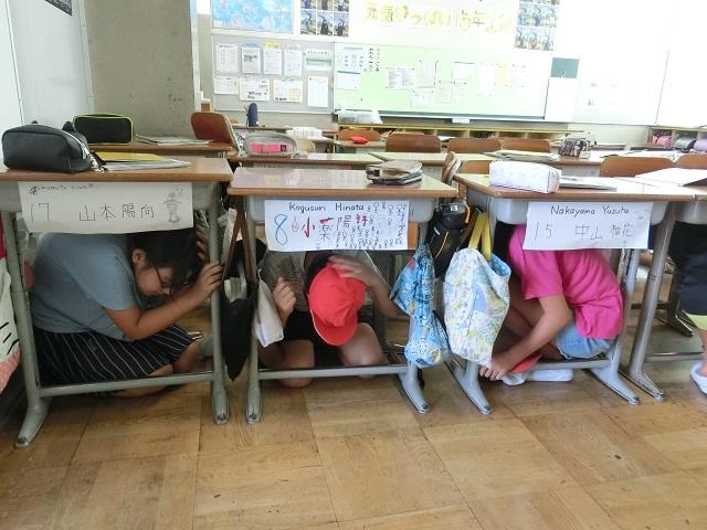 2校時終了直後ということで授業は終わり,たわらの時間になった設定です。子供たちは,放送を聴いて自分で判断しなければならず,一週間前から避難経路や避難の判断を事前指導してきました。