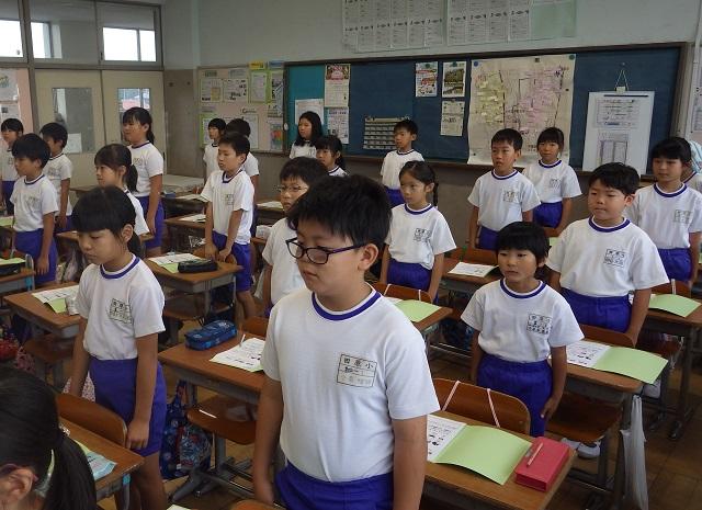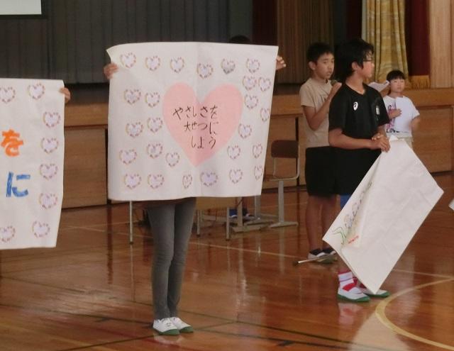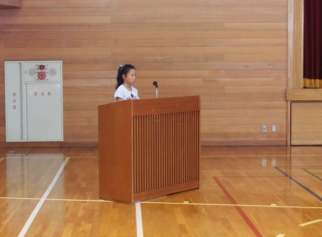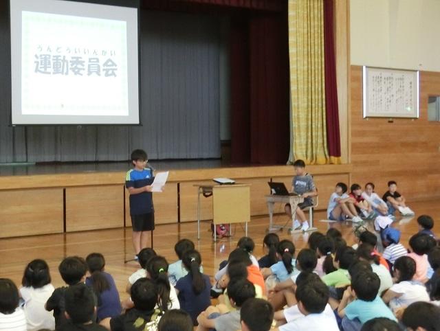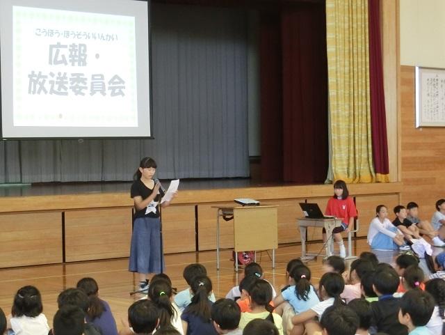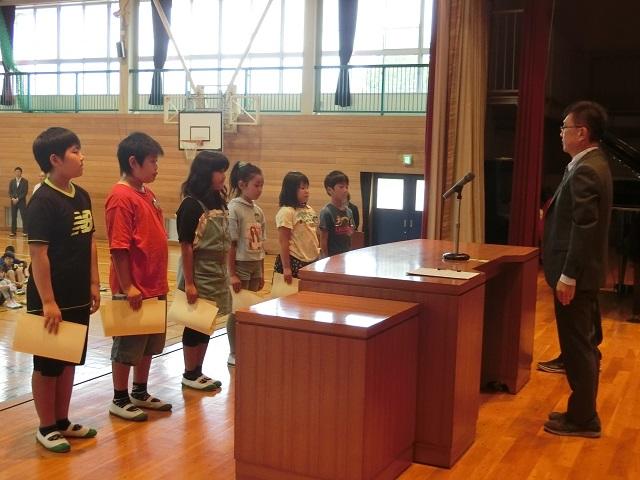 最初に,運営委員の掛け声で全員であいさつをした後,標語や作文,習字,スポーツテスト,陸上大会などで活躍した子たちの表彰を行いました。みんな立派な態度で賞状をいただいていました。