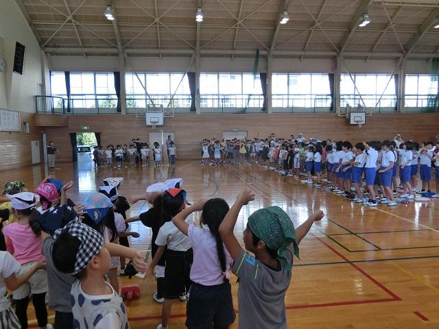 体育館への移動にも注意を払い,窓や扉の全面開放し,両手間隔を取った整列で集合しましたが,本校の児童数と体育館の規模ではギリギリのようです。万一,体育館へ避難する状況があってもなんとかできることが分かりました。