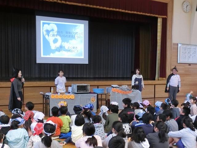 田原中保健委員会の生徒たちは内臓や骨が表されたTシャツを着用し,さらに今年度は脳の模型なども使って,健康・給食委員会の児童と一緒によい姿勢の大切さを伝えてくれました。