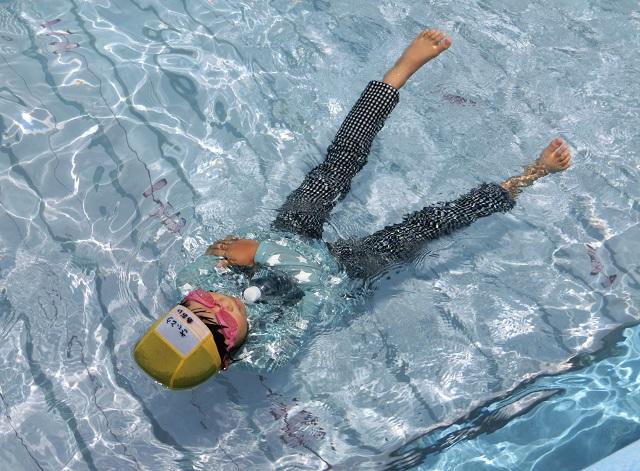 久しぶりに晴天となった今日,1年生がようやく初めてプールに入ることができました。