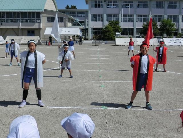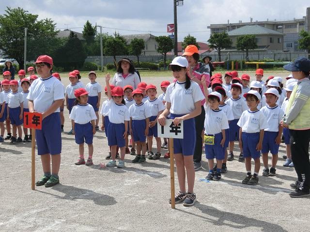 晴天の中で始まった最初の全体練習は,開会式の練習です。1回目にもかかわらず,進行もスムーズに行えました。それは,これまでの6年生の皆さんの下準備がしっかりできていたからです。1年生の基準となる子も堂々と手を挙げ,大きな声で返事ができました。