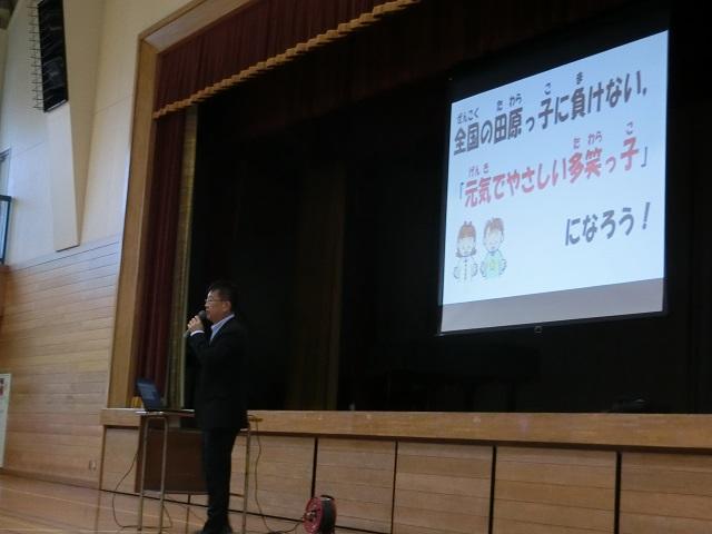 元気なあいさつの後,校長先生から講話がありました。昔の田原小学校の様子を簡単に紹介した後,「田原小学校は全国にいくつある?」というクイズが出されました。答えは15校で,子供達からは驚きの歓声が上がりました。
