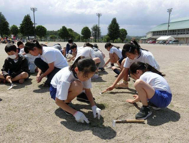 運動会に向けて,校庭の除草作業に全校生で取り組みました。