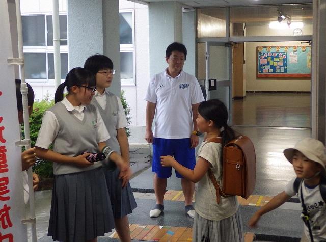 今日から一週間は,まず1~4班での実施です。校舎前では,明るく元気なあいさつの声が響いていました。