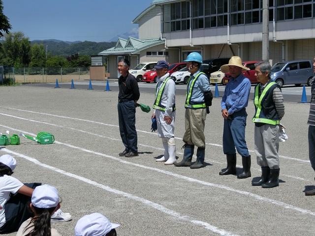 地震から火災発生という場面設定で,今年度最初の避難訓練が実施されました。もちろん1年生は初めての体験です。訓練には,河内分署の皆様が指導に来てくださいました。教室で地震から身を守る体勢をした後,火災発生の報を聞いて,一斉に校庭に避難しました。全校生が避難完了するまで,約4分でした。1年生も,大きな声で話す子もなく,とてもよくできました。