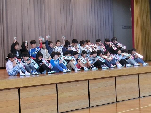 始めに5年生の演奏で愛唱歌「世界が一つになるまで」を全校生で合唱し,その後1年生の発表になりました。鍵盤ハーモニカによる「きらきら星」の合奏と,「虹」の合唱です。体全体で表現する,楽しく素敵な発表でした。